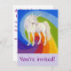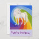 Jolie licorne entourée d'un arc-en-ciel, invitation les invités à une fête d'anniversaire.