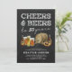 Cartes d'invitation pour une fête d'anniversaire rustique pour adultes de 50 ans avec un fond de tableau noir, une sélection de bières à l'aquarelle, un bretzel et un tonneau de bière, la phrase "à la santé et à la bière pour 50 ans" et un modèle de fête moderne facile à personnaliser.