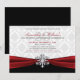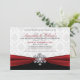 Un beau thème hivernal avec un ruban rouge profond et soyeux, un flocon de neige argenté et un fond en damas blanc pour ces invitations de fête personnalisées.