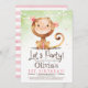 Jolie fille singe rose et vert 1er anniversaire invitation fête. Arrière - plan aquarelle et rayé en arrière.