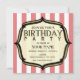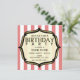 Un cirque vintage inspiré de l'invitation de fête d'anniversaire avec un arrière - plan de rayures rouges et blanches défraîchies sur l'avant et le dos. avant présente cadre doré décoratif encadré en noir. Personnaliser avec les détails de votre occasion. com