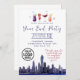 Invitation cocktail aquarelle d'entreprise avec vue sur la skyline pour célébrer la fin d'année et souhaiter de bonnes fêtes aux employés et collègues. Idéal pour les événements organisés à New York ou dans d'autres villes urbaines avec des gratte-ciel. Personnalisez le texte et incluez le logo de votre entreprise.