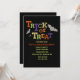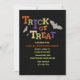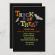 Une invitation festive d'Halloween avec les lettres des mots "tricher ou gâter" en différentes couleurs contre un arrière - plan noir. Des chauves-souris volantes entourent les mots.