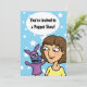 Une invitation à la fête avec une joyeuse femme caricaturiste aux cheveux frisés tenant une drôle de marionnette de gant de monstre violet sur un arrière - plan couvert d'une étoile bleue. Vous pouvez customiser tout le texte en fonction de vos besoins. Idéal pour tout parti où un marionnettiste se prépare.