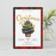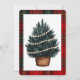 Cette carte est pour une invitation à la fête de Noël. Il présente un design festif avec une bordure en plaid aux couleurs traditionnelles de Noël, rouge, vert et noir. Au centre, il y a une illustration d'un arbre de Noël décoré de lumières à cordes douces et brillantes. Le texte dit **"Rejoignez-nous pour une fête de Noël"** en caractères d'or gras. Sous l'arbre, les détails de l'événement sont clairement indiqués, y compris la date et l'emplacement. Les informations du RSVP sont fournies en bas, demandant aux clients de répondre à une date précise. L'ensemble est gai, accueillant, et reflète l'esprit de la saison des fêtes.