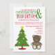 Une invitation à la fête de Noël et à la promenade de jouets avec un schéma de couleurs rouge et vert et l'illustration d'un arbre de Noël et d'un ours brun avec pattes et oreilles de pois et de points de polka rouges et verts. Personnalisez le texte avec les détails de votre occasion.