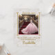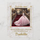 L'image représente une jeune fille Quinceanera posant pour la photo, descendant l'escalier d'un salon de luxe orné de motifs dorés et de lustres. C'est une célébration traditionnelle hispanique pour la fille qui a 15 ans, et elle sera présentée à la société comme une demoiselle.
