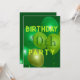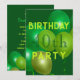 Invitation de fête d'anniversaire verte pour adulte mâle ou femelle. De gros ballons dans les tons verts décorent les deux côtés de ces cartes plates. Texte audacieux sur le front pour annoncer une fête, avec une place pour son âge. Parfait pour un événement marquant en mars, ou pour célébrer un Irlandais.