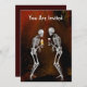 Invitation tous vos amis maladroits pour une soirée cocktail Halloween amusante, avec cette drôle d'invitation à la fête Halloween sur le thème du squelette. Des graphismes d'un arrière - plan éffrayant et deux squelettes se mêlant aux cocktails décorent le devant de l'invitation. Vous êtes invité en texte blanc, sur le devant et le texte d'invitation principal, sur le côté arrière de la carte. Personnalisez votre événement Halloween.