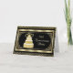Invitation à la fête d'anniversaire de mariage de 50 ans. Une carte magnifique en noir et or avec un gâteau doré surmonté de cœurs et un encadrement orné.