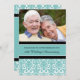 Carte d'invitation personnalisée pour la fête du 50e anniversaire de mariage en bleu turquoise élégant, motif damassé floral classique noir et blanc, délicat et moderne. Personnalisable avec les détails de votre fête et votre propre photo.