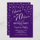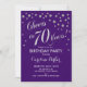 70th Birthday Party Invitation Design élégant en fausse parties scintillant argent et violet. Salutations à 70 ans !