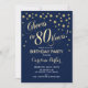 80e anniversaire invitation pour femmes ou hommes. Elégante carte invitation en or marine et fausse parties scintillant. Comprend une police de script et des confettis. Salut à 80 ans ! Idéal pour une célébration anniversaire de jalons élégante.