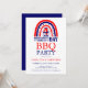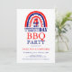Invitation à la fête du barbecue et des feux d'artifice pour la fête de l'indépendance américaine du 4 juillet avec des étoiles et des bandes. Fond blanc et typographie personnalisable en rouge et bleu.