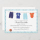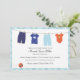 Ces adorables invitations à la douche pour bébés sont accompagnées des vêtements de bébé les plus mignons, accrochés le long d'un étendoir.