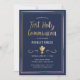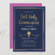 Cette invitation de la Première Communion moderne et classe présente une craie d'or illustrée, une bordure bleue, rose, violette et or, et les mots "Première Communion sainte" en or. Le arrière - plan est bleu marine, mais peut être customisé à n'importe quelle couleur. Le texte est personnalisable pour votre sacrement religieux spécial.