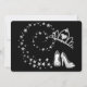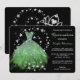 Voici une belle et élégante invitation pour cette toute importante Quinceanera! Il présente une robe brillante et brillante dans les tons vert printanier pastel, entourée d'étoiles brillantes en argent. Votre texte personnalisé est en argent et vert pâle sur le côté droit. Tout est placé sur un arrière - plan noir spectaculaire. Le dos de l'invitation est aussi noir, avec une tiara en argent et des chaussures à talons hauts, encore entourées d'étoiles en argent. Magnifique, comme elle l'est !