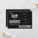 Cette invitation de réception après mariage présente un design de tableau noir et blanc avec les mots "Mangeons et buvons parce que nous sommes mariés !" sur le devant, ainsi qu'un espace pour "écrire" vos noms en biais sur le tableau, ainsi que la date de votre mariage. Au verso de l'invitation de réception après mariage figurent les noms d'avant le mariage de la mariée et du marié, ainsi que le lieu de leur mariage et les détails de la réception après mariage. Une façon moderne et amusante d'inviter vos invités à une réception après mariage.