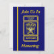 Cette invitation bleue et or est décorée sur le devant avec le logo d'un badge personnalisé du chef de police. Vous pouvez customiser cette carte en plaçant vos informations dans les cases fournies. Vous pouvez également customiser l'insigne à l'avant et à l'arrière avec le nom de l'honoré.