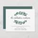 Carton chic d'invitation de mariage botanique permettant aux invités de savoir que la célébration se poursuivra dans la nuit ! L'invitation à l'après-fête présente des feuilles de eucalyptus vert luxuriant illustrées à l'aquarelle, encadrant "la célébration continue" dans un élégant script de calligraphie manuscrit. Personnalisez avec les détails de votre après-fête de mariage le long du bas. La petite taille s'insère dans les enveloppes de votre invitation de mariage en tant qu'encart, ou peut être envoyée séparément avec les enveloppes incluses.
