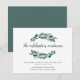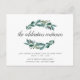 Carton d'invitation de mariage botanique chic qui informe les invités que la célébration se poursuivra la nuit ! L'invitation à la soirée après-mariage comporte des feuilles de eucalyptus vert luxuriant illustrées à l'aquarelle, encadrant "la célébration continue" dans un élégant script calligraphié manuscrit. Personnalisez avec les détails de votre soirée après-mariage le long du bas. La petite taille s'insère dans les enveloppes de votre invitation de mariage en tant qu'encart, ou peut être envoyée séparément avec les enveloppes incluses.