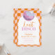 Cette invitation à la fête de bachelorette présente une esthétique d'inspiration rétro avec une touche ludique et un motif à damiers dynamique en alternant des carrés orange et rose et des détails dorés. Photo Mockup par freepik.