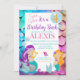 Cette mignonne fête d'anniversaire à thème de sirène est parfaite pour la prochaine fête de natation de votre enfant ou même juste une fête magique de sirène. Mignonnes sirènes avec bulles et coquillages de mer avec quelques adorables sirènes. Tous les renseignements personnels peuvent être modifiés. À l'arrière, vous trouverez également une plage aménagée avec des sirènes et un coffre au trésor. Vous pouvez également mettre des instructions ou plus d'informations à l'envers.