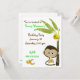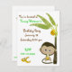 Jolie et colorée invitation à la fête d'anniversaire des enfants, faite dans un style de dessin animé, avec un point de polka blanc arrière - plan de vert pâle, tan et marron. Un mignon singe caricaturiste mangeant une banane assise sous un palmier donne à l'invitation de ce gamin un aspect amusant et passionnant. Customisez tous les champs de texte selon vos besoins, avec le style de texte, la couleur et la taille.