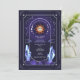 Invitation à l'événement Mystic Sun avec un design mystique inspiré de l'astrologie, de l'ésotérisme, de l'occultisme et d'éléments mystérieux. Ce design présente des teintes de bleu, de violet et d'orange, un fond étoilé, des cristaux, des constellations, un soleil avec un visage et des phases lunaires. Le design peut être personnalisé pour tous types d'événements, y compris les enterrements de vie de jeune fille, les mariages, les anniversaires, les fiançailles, les anniversaires de mariage, les soirées de filles, les remises de diplômes, les baby showers, les départs à la retraite, les pendaisons de crémaillère et autres fêtes. Comprend un modèle pour une personnalisation personnelle.