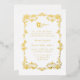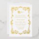 Faire-part de mariage doré orné en blanc avec des vignes roses d'or encadrant la zone de texte et un seul rose à tige longue en haut de la zone de texte. Personnalisez le texte du feuillet pour répondre à vos besoins mariages.