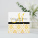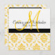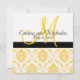 Belle Invitation Mariage damassé jaune et blanc avec monogramme sur le devant et faire-part de mariage texte sur le dos. Montré avec un exemple de libellé pour permettre l'écriture manuscrite du nom du client sur l'invitation. Tous les éléments, sauf les damas, peuvent également être customisés, ce qui permet de modifier les couleurs des lignes, des carrés et du texte.Conception de la disposition des Faire-part de mariage par Elke Clarke © 2010. Graphiques sous licence. Customisez avec vos informations et couleurs mariages.