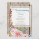 Une charmante invitation à la maison rustique avec un joli bouquet fleuri sur un arrière - plan en bois avec cadre en dentelle blanche.
