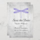 Élégante et simple invitation de mariage à sauver la date, mettant en vedette une libellule violette sur un fond gris grunge. Ce design est un choix unique pour annoncer un mariage moderne. Facile à personnaliser avec vos détails de mariage. Cliquez sur "Personnaliser" pour trouver plus d'options de personnalisation.