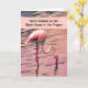 Carte d'invitation à un chalet de plage tropical. Le design est un Flamant rose rose posé dans de l'eau rose.