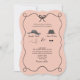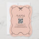Un faire-part de mariage fantaisiste dessiné à la main avec des illustrations ludiques d'une cravate casquette vintage et arc, encadré par une bordure romantique en ruban noir sur rose doux et roux. La coupe unique en forme de crochet ajoute charme et élégance, tandis que le dos dispose d'un code QR RSVP pratique pour une touche moderne. Ce design est parfait pour les couples à la recherche d'un mélange original et élégant, idéal pour des célébrations décontractées, d'inspiration vintage ou créatives. Entièrement personnalisable et délicieusement différent.