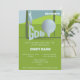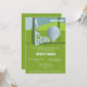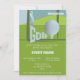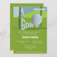 Cette invitation incroyable pour un événement de golf présente une image fantastique d'un golfeur et d'une grosse balle de golf avec le texte golf au premier plan d'une colline verte époustouflante – parfait pour tous les amateurs de golf ou les clubs de golf !
