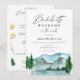 Invitation au week-end de bachelorette dans les bois avec itinéraire au verso. Illustrations aquarelles de montagnes, d'arbres et d'un lac avec accessoires de camping au verso. Personnalisez avec votre texte. Cliquez sur "cliquez pour personnaliser davantage" pour changer le style, la taille ou la couleur de la police et déplacer les zones de texte.