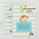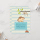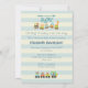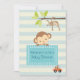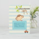 Une invitation à une baby shower - sur le devant, des singes mignons sont suspendus, invitant vos invités à une baby shower. Au dos se trouve une illustration d'art de nurserie pour enfants représentant un train jouet rempli d'animaux fantaisistes. Sur un fond rayé crème et bleu.