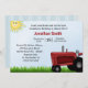 Invitation d'anniversaire Tracteur Rouge pour garçons ou filles qui aiment la vie à la ferme et les tracteurs. Le design présente un tracteur rouge assis dans l'herbe avec le soleil et le ciel bleu en arrière-plan. Ajoutez vos détails de fête en utilisant notre modèle facile.
