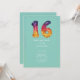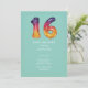 Fond sarcelle avec des ballons mylar « 16 » violets, roses et dorés à pois arc-en-ciel et texte blanc.