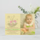 L'invitation de fête d'anniversaire pour le TEMPS DE PÂQUES parfait, dans un jaune doux, montrant des œufs décorés dans un nid de fleurs de la Reine Anne.