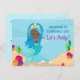 Rejoignez-nous sous la mer pour une fête d'anniversaire d'enfant fantaisiste pour une petite fille afro-américaine qui adore les sirènes aux cheveux violets. Ces cartes d'invitation de fête adorables présentent une sirène noire aux cheveux bleus qui nage autour du beau corail océanique. Un thème de fête dans une piscine pour enfants cool avec de l'eau bleu profond.