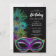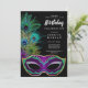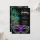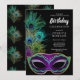 Cette invitation époustouflante comprend des plumes de paon scintillantes avec un masque festif de Mardi Gras.
