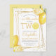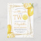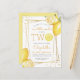 Cette invitation d'anniversaire pour un deuxième anniversaire sur le thème du citron comporte un cadre géométrique doré orné de citrons à l'aquarelle. Le mot "TWO" apparaît en lettres majuscules jaunes avec une tranche de citron à l'aquarelle à la place du "O". Ajoutez le nom de votre petit chéri et sa date d'anniversaire dans une écriture manuscrite jaune moderne et les détails de la fête en gris charbon sans empattement. Le dos de la carte est jaune uni. Un thème idéal pour une fête d'anniversaire estivale !