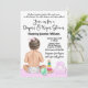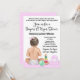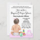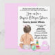 Invitation à une fête de couches et lingettes pour bébé avec une adorable petite fille et des jouets sur un fond rose à pois mignon.