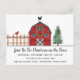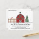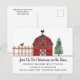 Carte postale d'invitation à une fête de Noël rustique à la ferme - avec une adorable grange rouge rustique toute décorée pour les fêtes. La carte postale fait partie d'une collection.