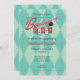 L'invitation à une soirée de bowling présente la typographie « Bowling Party » dans un logo rétro de style moderne des années 50, avec une boule et des quilles de bowling illustrées. Incorporant des éléments de bleu, rouge, blanc et gris, des points et un fond à motif diamant. Inclut un modèle pour une personnalisation personnelle.