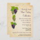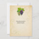 Un vignoble avec quatre grappes de raisins de cuve s'alignent le long du côté gauche de cette invitation destinée à une soirée de dégustation de vin ou un cocktail. Le vignoble serpente derrière les raisins sur un fond de parchemin. Le parchemin est répété au verso avec le vignoble pour toute information supplémentaire ou le texte peut être supprimé pour laisser le dos noir avec juste une grappe de raisins. Disponible avec des produits assortis.