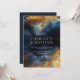 Ce faire-part de mariage céleste ciel est une interprétation abstraite moderne du thème mariage céleste. Le beige ocre foncé pour la forme lune et les noms du couple sur un bleu foncé et l'arrière - plan abstrait à thème doré font ressortir ce faire-part de mariage.