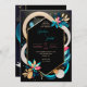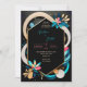 Cette image présente un design abstrait moderne et dynamique, adapté à un événement faire-part de mariage ou similaire. Le design est centré autour d'un cadre hexagonal noir avec un contour doré, dressé contre un arrière - plan foncé. Autour du cadre, des formes audacieuses, fluides, aux couleurs turquoises, roses, beiges et bleues foncées, apportant une touche dynamique et vivante à la composition. L'utilisation d'éléments floraux géométriques dans des couleurs contrastées renforce l'attrait visuel, rendant ce design frais et contemporain. L'agencement des couleurs et des formes crée un sens de l'équilibre et de l'harmonie, tandis que le cadre hexagonal fournit un point focal structuré pour tout texte ou détail qui pourrait être ajouté. Dans l'ensemble, ce design dégage un sens d'élégance moderne et de sophistication ludique, ce qui le rend parfait pour un mariage qui embrasse un thème coloré et contemporain. Personnalisez le texte concernant les noms et les détails du mariage. Vous pouvez télécharger la carte sur votre appareil mobile ou votre ordinateur.